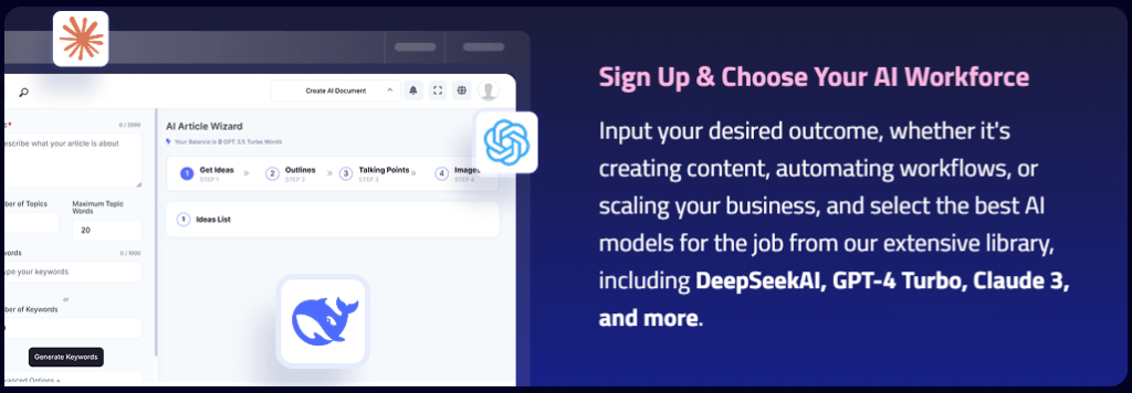 1.Sign Up & Select Your AI Workforce – Choose the AI models and tools best suited for your business tasks, such as content creation, automation, or chatbot development.