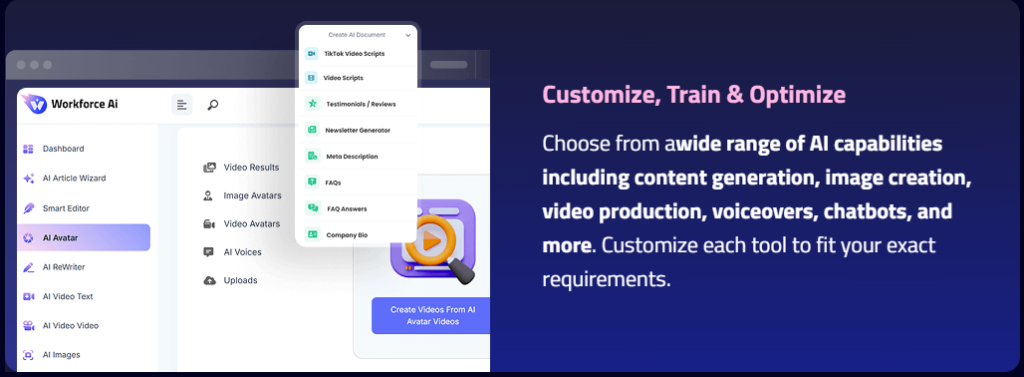 2. Customize, Train & Optimize – Adjust AI settings to align with your specific needs, fine-tuning content, voiceovers, and marketing strategies.